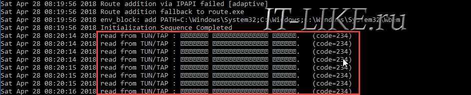 Обратите внимание на сообщения в чёрном окне, нет ли там повторяющихся строчек «read from TUN/TAP … (code=234)»