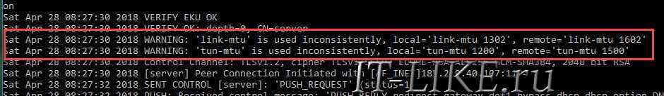 а также на сообщение где-то в середине «WARNING: ‘tun-mtu’ is used inconsistently, local…»: