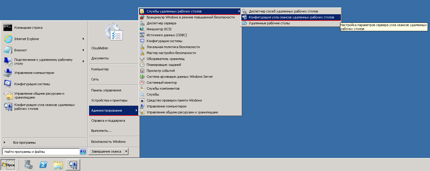 Настройка с помощью конфигурации служб удаленного рабочего стола