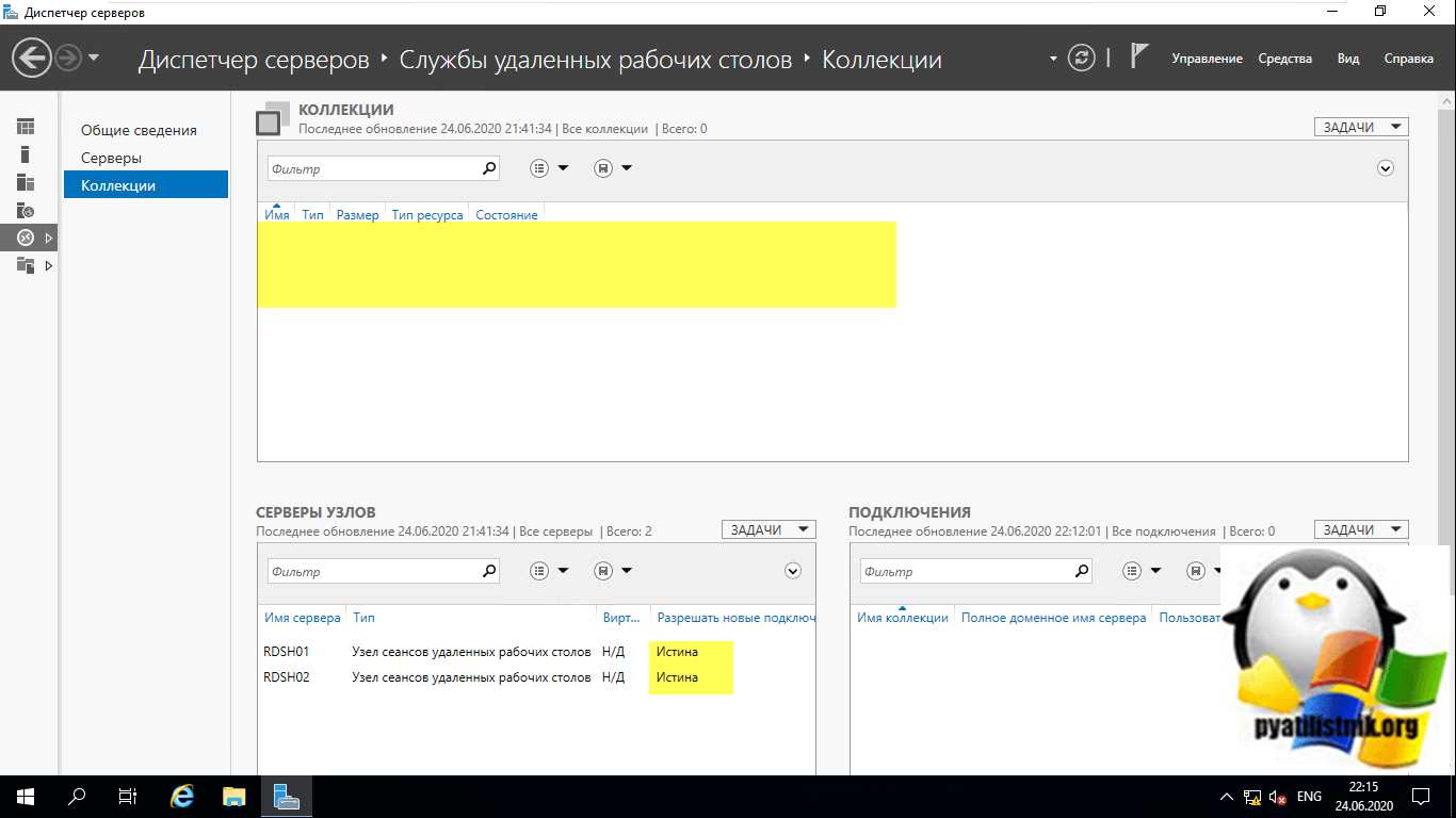Перейдите в раздел «Коллекции» и убедитесь, что список пуст, но зато присутствуют два ваших хоста узла сеансов удаленных рабочих столов, к котором будут подключаться конечные пользователи. Они будут иметь статус «Истина (True)», что говорит о разрешении подключаться (Режим стока выключен)