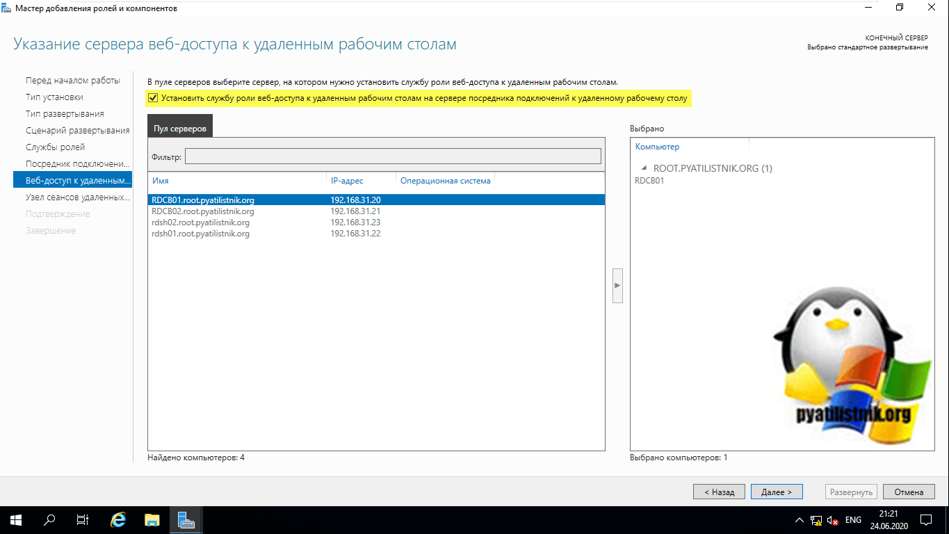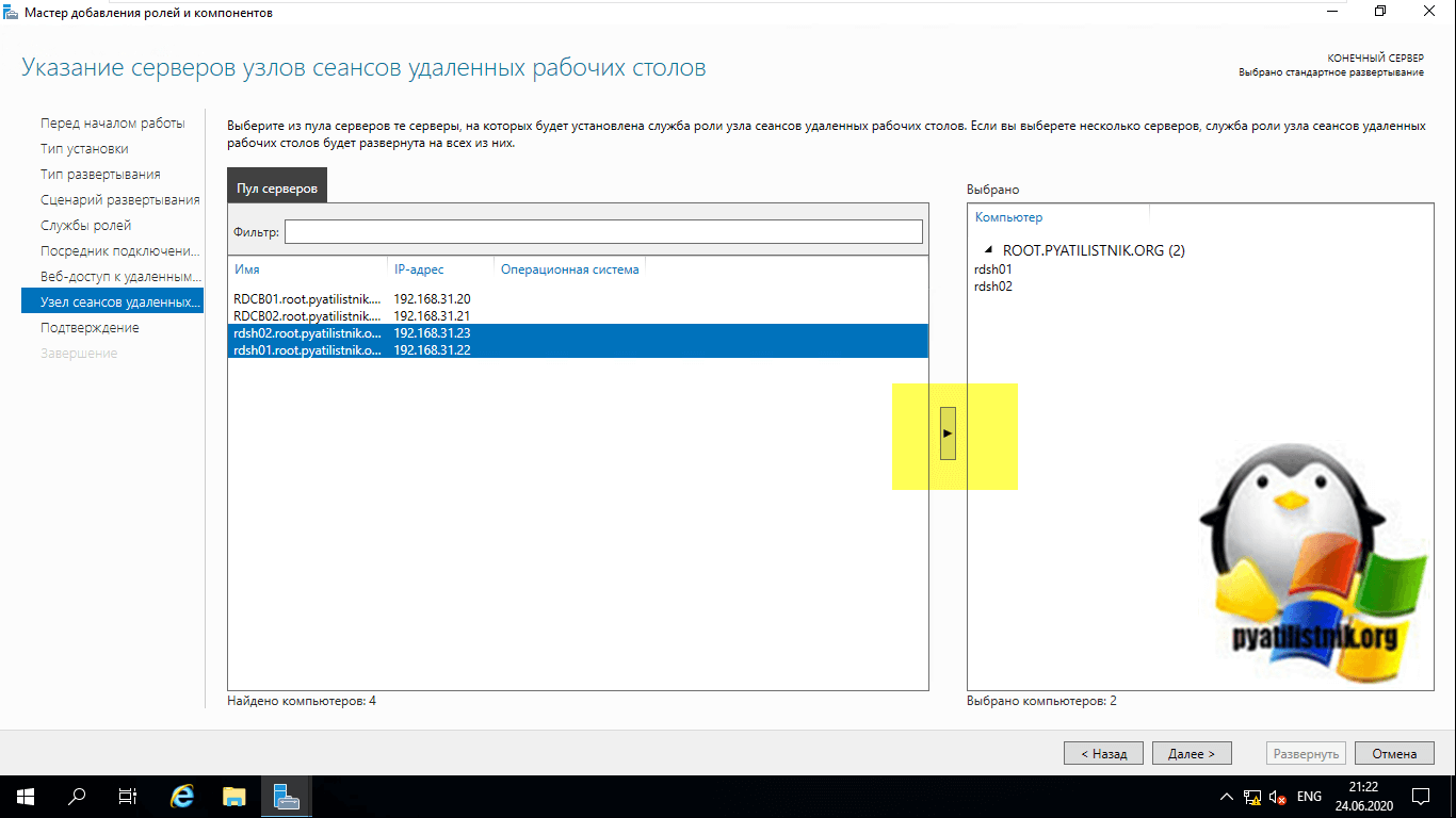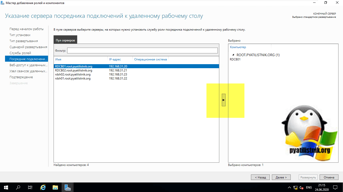 На следующем шаге вам нужно выбрать и перенести в правую область сервер, который будет нести на себе роль «Посредник подключений к удаленным рабочим столам (RD Connection Broker)». В моем примете, это первый сервер RDCB01.root.pyatilistnik.org.