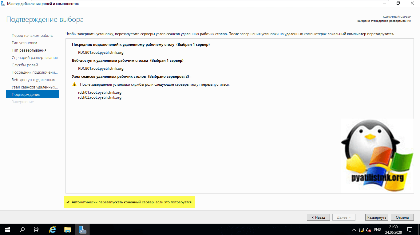 Процесс установки ролей подразумевает, что потребуется перезагрузка сервера, для этого вам необходимо выставить галку «Автоматически перезапускать конечный сервер, если это потребуется (Restart the destination server automatically if required )» и нажать кнопку «Развернуть»