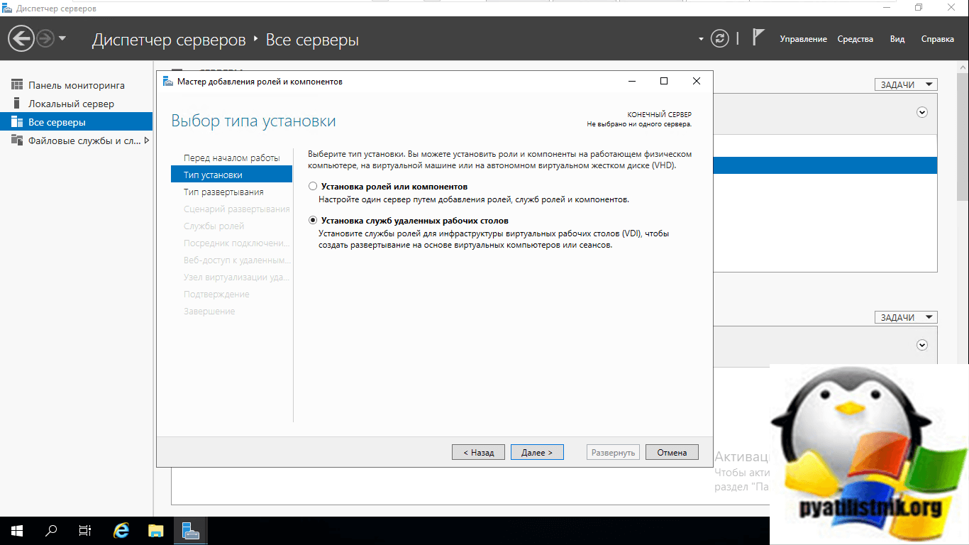 Выбираем первый пункт «Стандартное развертывание (Standard Deployment)» — данный тип развертывания позволяет устанавливать роли Remote Desktop Services на нескольких серверах одновременно.