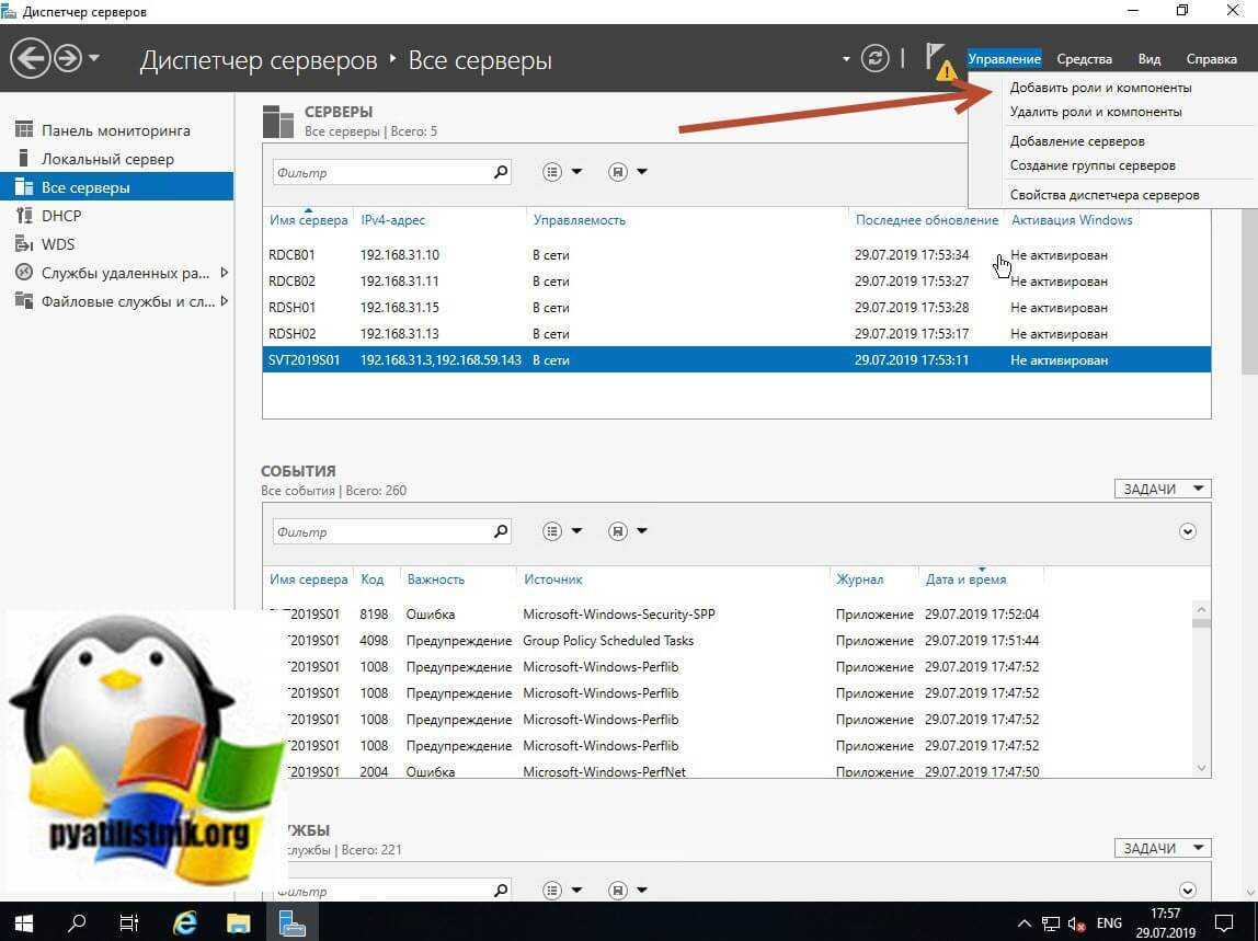Перед тем как создавать высоко доступную ферму RDS, вы должны произвести базовую инсталляцию, а именно нам необходимо установить три роли на текущие сервера, для этого в правом верхнем углу выберите пункт «Управление — Добавить роли и компоненты».