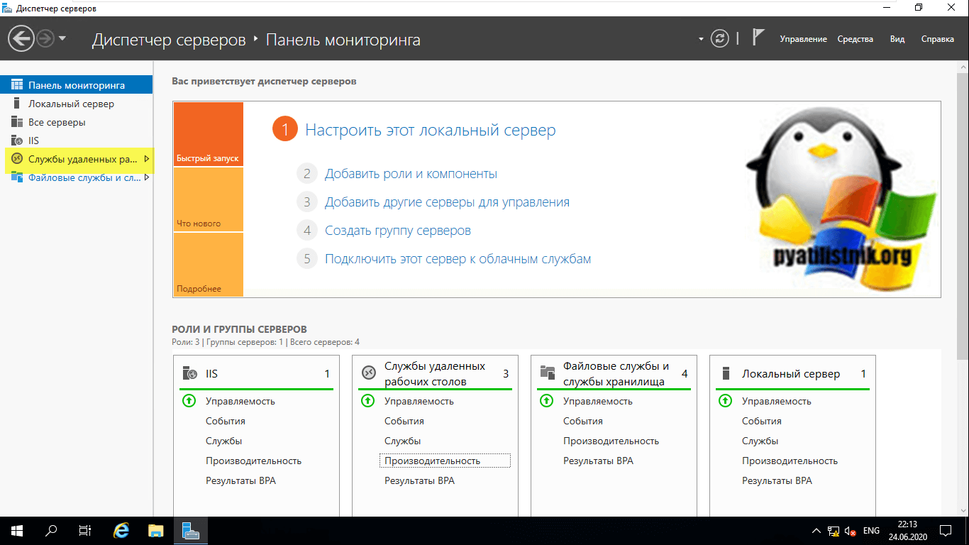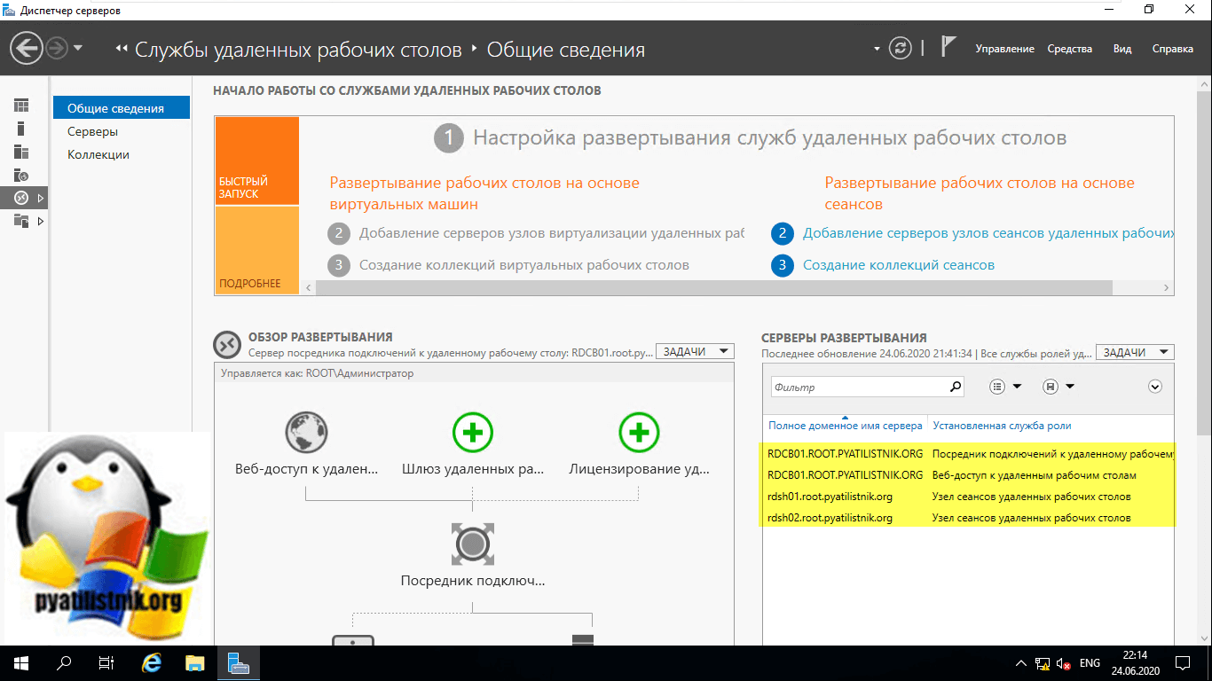 Давайте убедимся, что все серверы получили свои роли. Для этого на сервере, где вы добавляли сервера в оснастку «Диспетчер серверов (Производили установку)», откройте оснастку и перейдите в раздел «Службы удаленных рабочих столов».