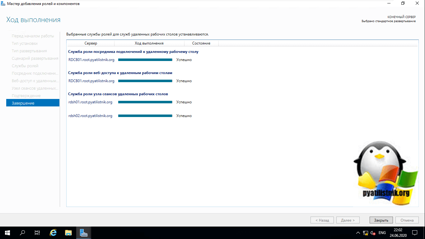 У вас должна произойти успешная установка службы «службы удаленных рабочих столов». Все необходимые сервера будут перезагружены.
