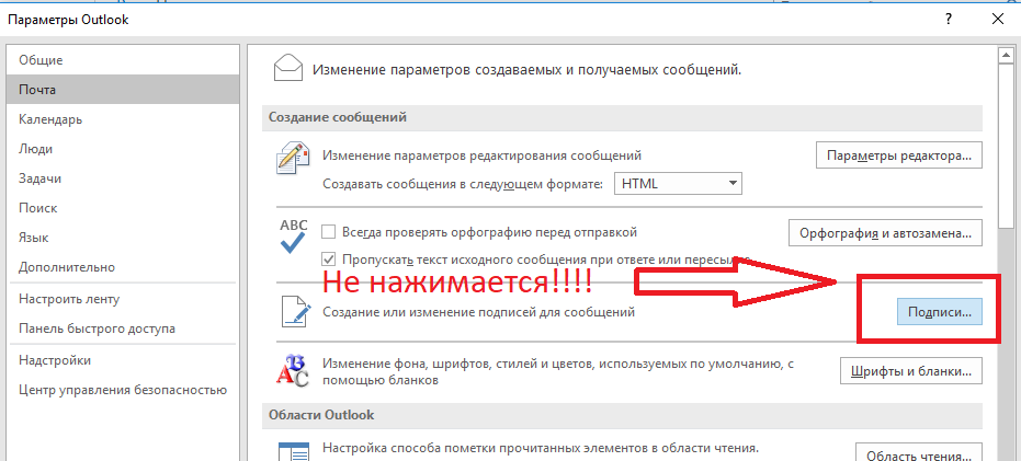 Уже несколько раз встречался с багом Outlook разных версий, когда перестает работать кнопка создания подписи. Сколько раз не нажимай на кнопку Подпись, окно создания подписи не появляется.