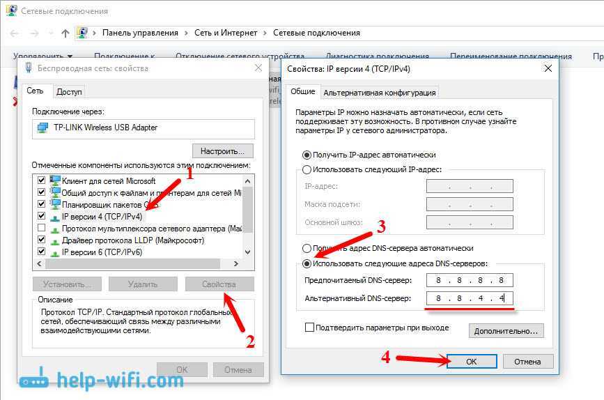 Выделяем пункт «IP версии 4 (TCP/IPv4)», и нажимаем кнопку «Свойства». Дальше ставим переключатель возле «Использовать следующие адреса DNS-серверов», и прописываем адреса, как показано на скриншоте ниже.