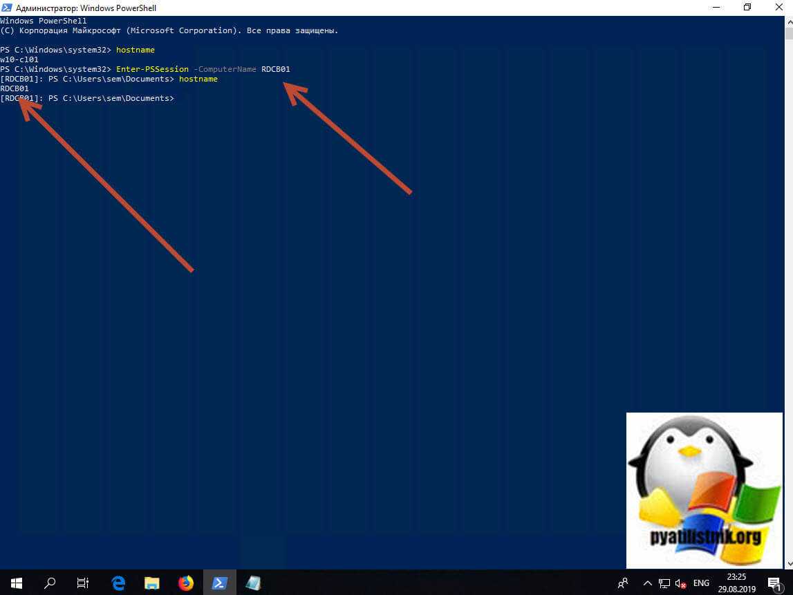Открываем PowerShell, командой hostname я показываю, что сижу на компьютере W10-cl01. Далее для удаленного подключения вводим команду: