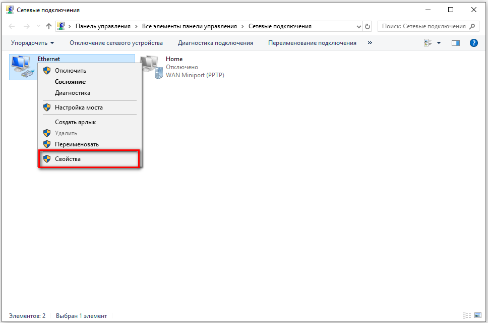- Откроются сетевые подключения, среди которых нужно найти то, которое имеет доступ к интернету — вычислив такое подключение, нажимаем на нем правой кнопкой мыши, и выбираем пункт контекстного меню «Свойства».
