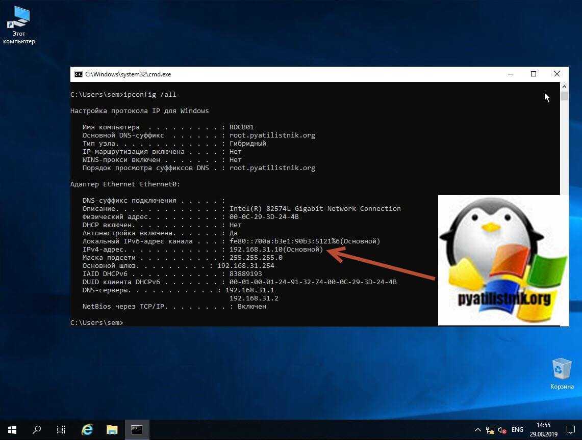 Сохраняем все настройки и проверяем через Ipconfig /all, что все видится. Так же можете попробовать пропинговать ваш основной шлюз или DNS-сервер. На этом графическая настройка сети в Windows Server 2019 окончена.