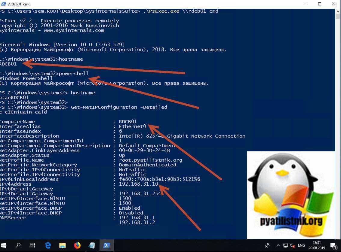 Введя все ту же команду hostname я вижу, что подключен к удаленному серверу RDCB01, при желании вы можете использовать для настройки сети netsh или PowerShell, что нравится больше.