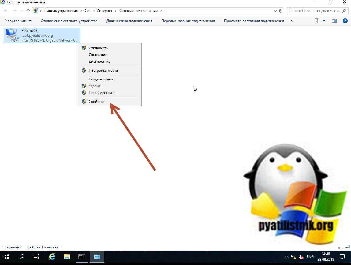 теперь заходим в свойства вашего сетевого интерфейса, через правый клик по нему.