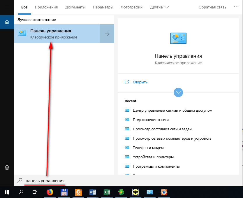 И в поисковой строке ввести «Панель управления». Далее щелкнуть мышкой по «Панель управления — Классическое приложение»: