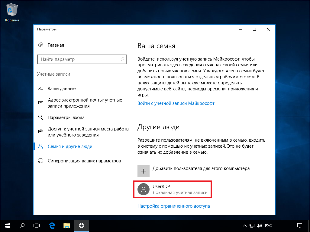 6. В окне параметров Вы увидите нового пользователя (прим. в данном примере это UserRDP) (Рис.6).