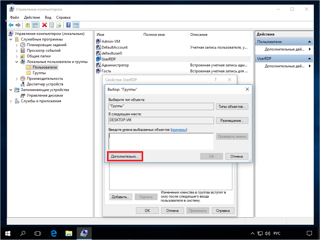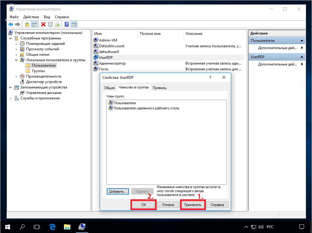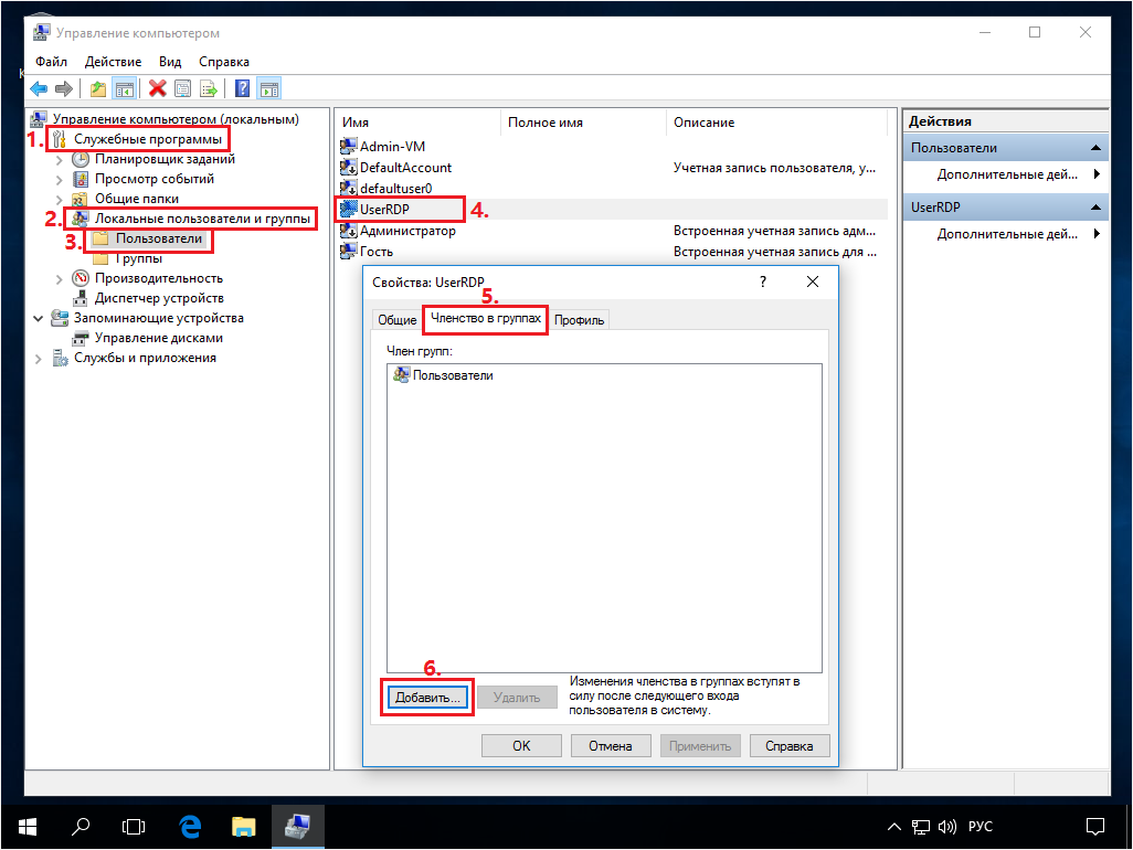 В открывшемся окне выберите: Служебные программы>Локальные пользователи и группы > Пользователи, затем выберите пользователя (прим. в данном примере это UserRDP), перейдите на вкладку Членство в группах и нажмите Добавить… (Рис.8).