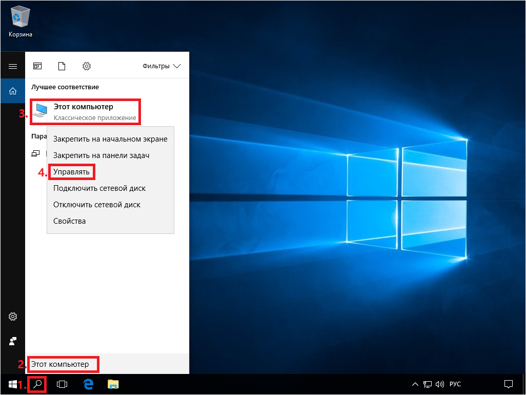 7. Нажмите на значок поиска , затем с помощью поисковой строки найдите и выберите Этот компьютер, через правую кнопку мыши откройте меню и нажмите Управлять (Рис.7).