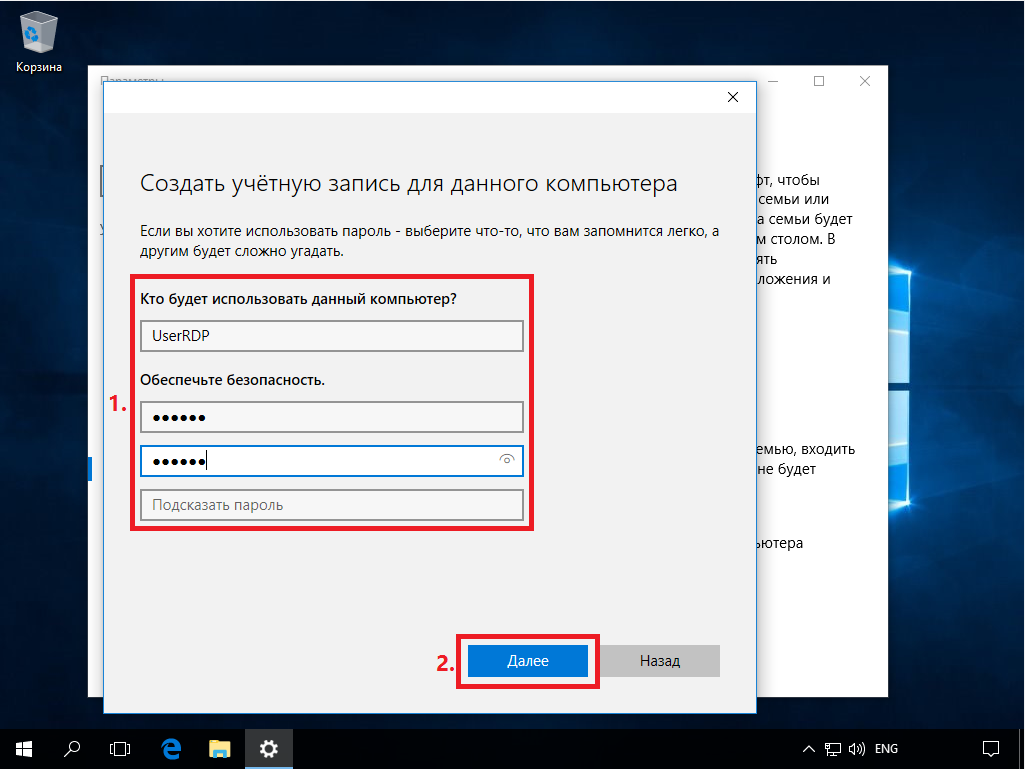 5. В соответствующих полях введите имя пользователя (прим. в данном примере это UserRDP), пароль для новой учётной записи и подсказку для пароля, затем нажмите Далее (Рис.5).
