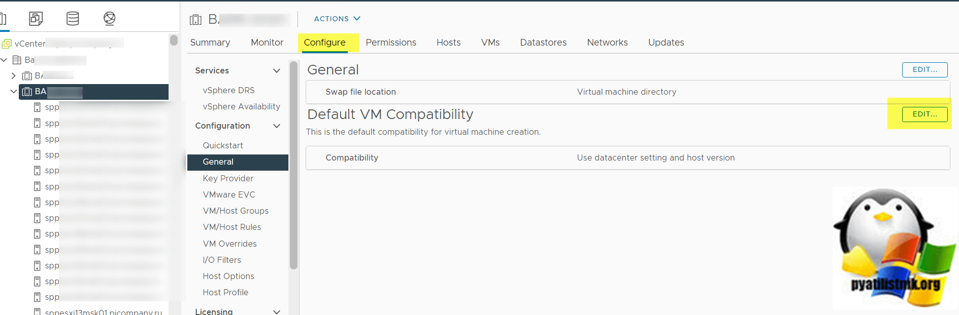 На уровне хоста выбрать режим совместимости можно по пути «Configure — Virtual Machines — Default VM Compatibility» (Вы можете установить совместимость только на хостах, которые не являются частью кластера.)