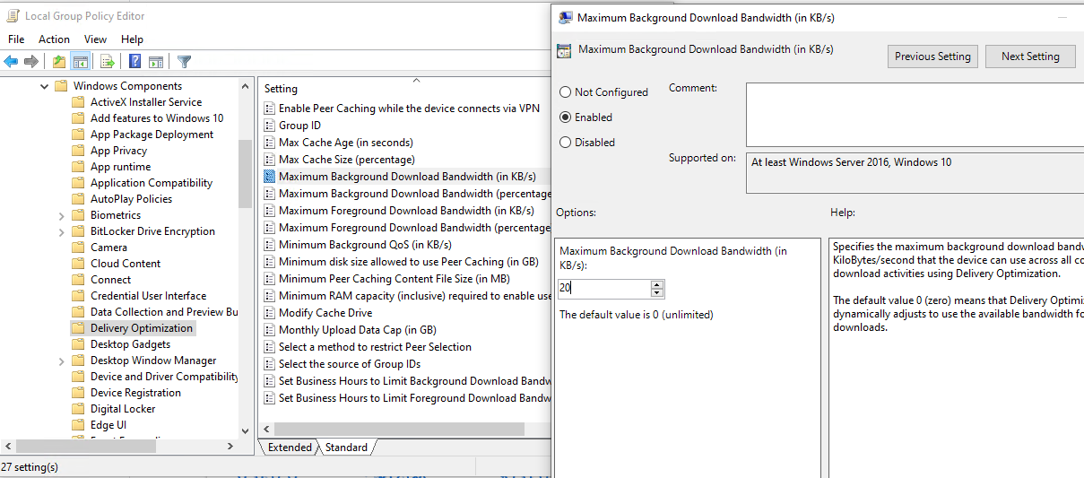 Например, у вас имеется домен на базе Windows Server 2016 и компьютеры в домене, которые обновились до билда Windows 10 2004. В этом билде, например, появилась новая опция Delivery Optimization для управления механизмом Windows Update for Business (WUfB). Теперь вы можете указать максимальную пропускную способность, которую технология Delivery Optimization может использовать для фоновой загрузки обновлений.