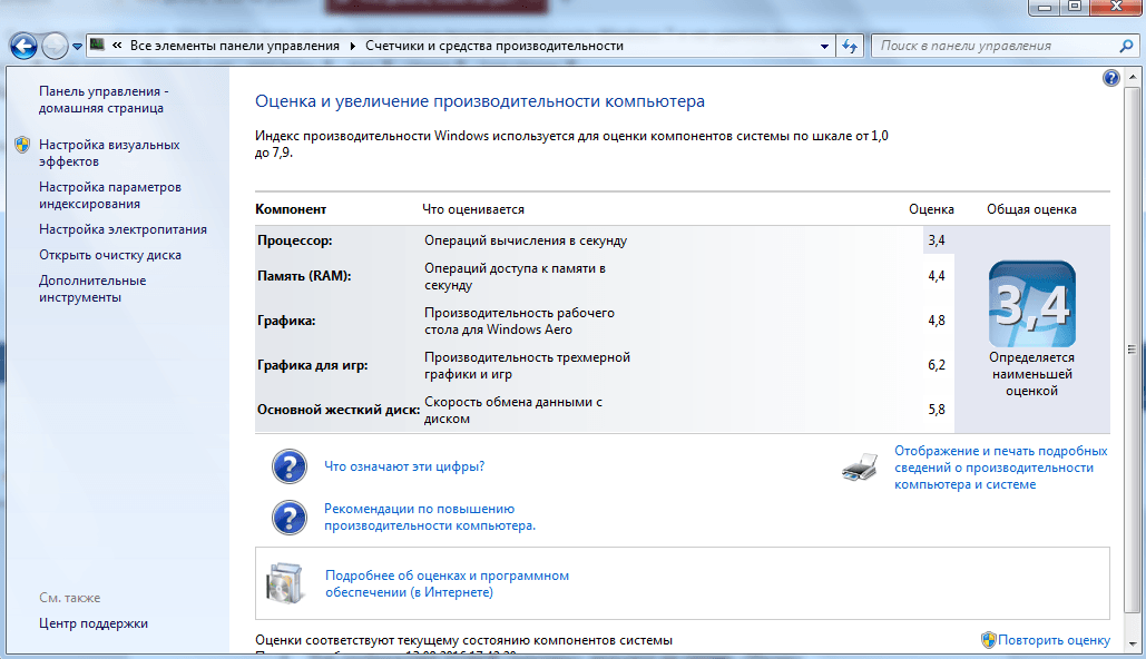 Несложно догадаться, что баллы, которые вы увидите в таблице — оценка производительности того или иного компонента системы. Операционная система Windows 7 таким образом оценивает то, с какими задачами может справиться компьютер. Если эти оценки высокие, то беспокоиться не о чем, так как ваш ПК может успешно работать даже с трудоёмкими задачами, а если вы видите значения, близкие к 1, то стоит задуматься о модернизации.