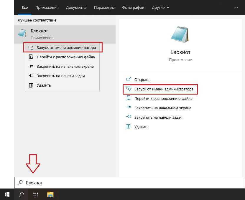 Открываем поиск и вбиваем «Блокнот». Выбираем «Запуск от имени Администратора»: