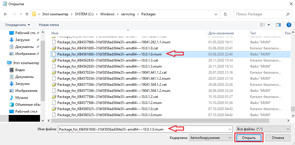 Ищем файл с расширением .mum, у которого имя будет начинаться с Package_for_KB_НОМЕР_ОБНОВЛЕНИЯ и выбрав нужное, нажимаем «Открыть»: