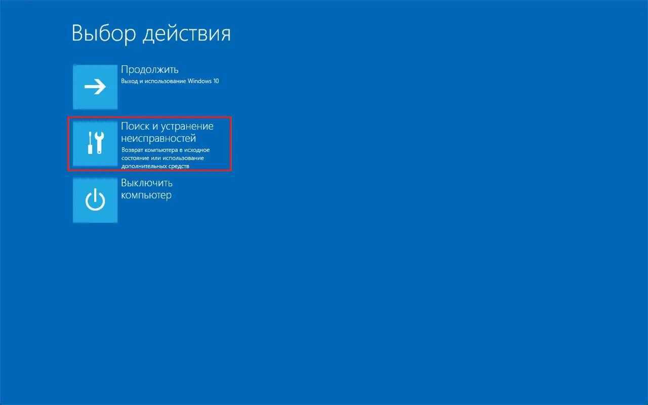После перезагрузки, вам будет предложено выбрать варианты решения проблемы. Выбираем Поиск и устранение неисправностей: