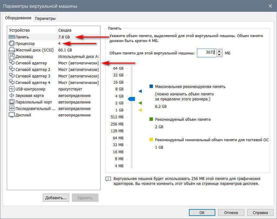 Уменьшаем память, уменьшаем число ядер процессора, добавляем привод (если он не эмулировался), удаляем лишние сетевые адаптеры и т.п. Сетевой адаптер оставляем один и ставим его значение NAT (стандартное значение). В общем, правим в настройках всё, что нужно подправить.