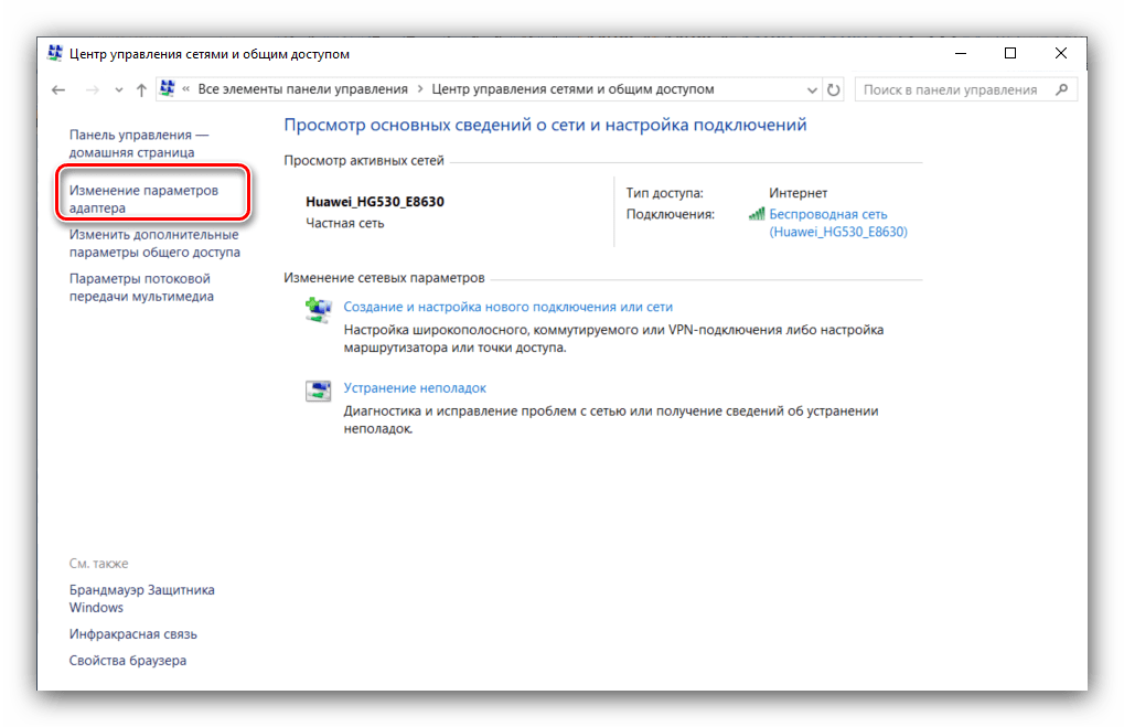 - Проделайте шаги 1-2 второго этапа, после чего в перечне опций «Центра управления сетями…» воспользуйтесь ссылкой «Изменение параметров адаптера».