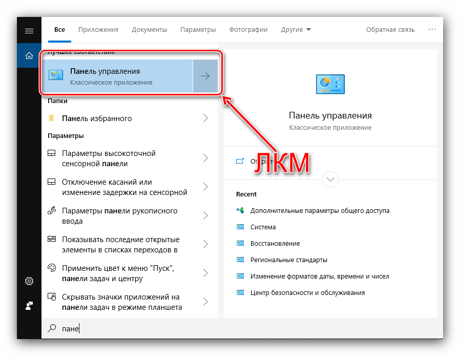 - Вызовите «Панель управления»: откройте «Поиск», начните вводить в него название искомого компонента, а когда он отобразится, щёлкните по нему левой кнопкой мыши.