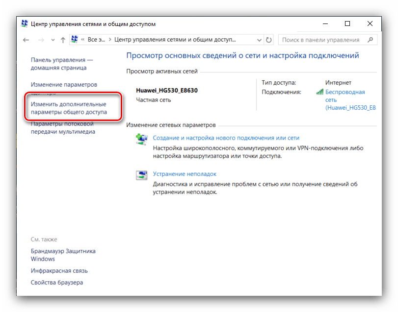 Одним из первых действий при подобной ошибке будет просмотр и корректировка настроек общего доступа. Для этого следует выполнить следующее: