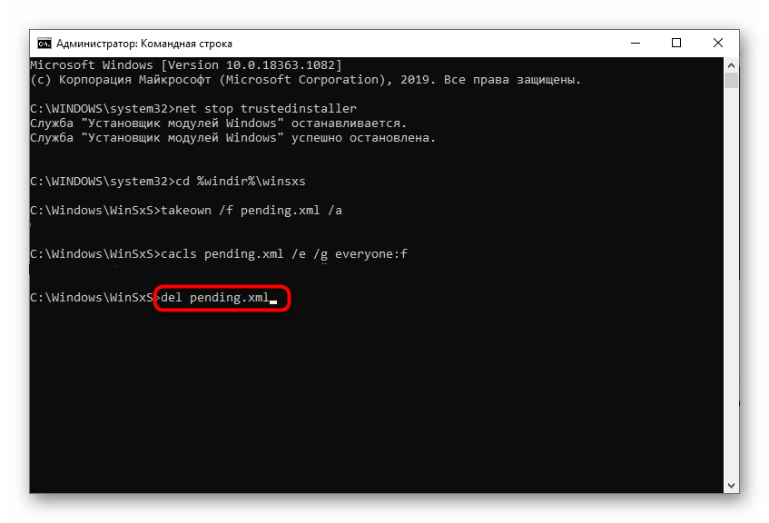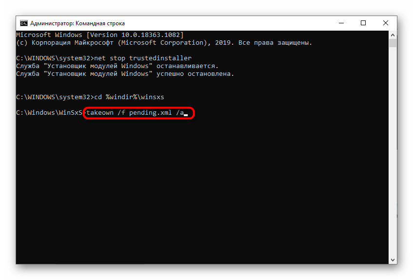 Впишите команду takeown /f pending.xml /a, завершающую процесс файла, и подтвердите ее нажатием по клавише Enter.