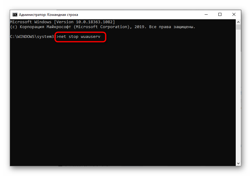 - Откройте консоль и первой командой остановите службу, отвечающую за инсталляцию обновлений, чтобы получить доступ к удалению файлов. Это осуществляется вводом net stop wuauserv.