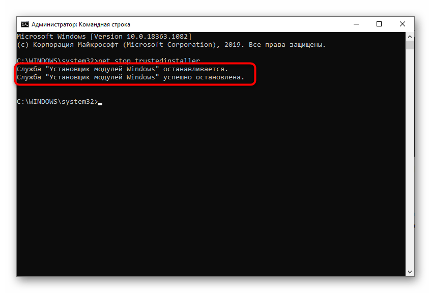 Дождитесь появления уведомления об успешной остановке службы и переходите далее. Если она уже остановлена, просто игнорируйте сообщение и напишите следующую команду.