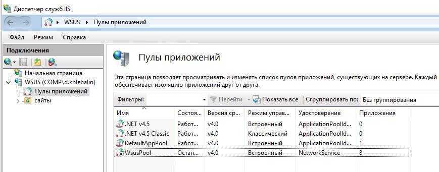На сервере WSUS, открываем настройки IIS и запускаем или рестартуем св пулах приложений WSUSPool