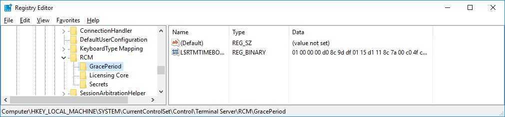 Чтобы продлить grace период в RDS нужно на сервере удалить параметр реестра, в котором задается время отсчета льготного периода лицензирования (grace period licensing). Дата, определяющая время окончания работы RDSH в режиме grace хранится в reg_binary параметре реестра L$RTMTIMEBOMB (довольно забавное имя –TIME BOMB …. ;), находящемся в ветке: