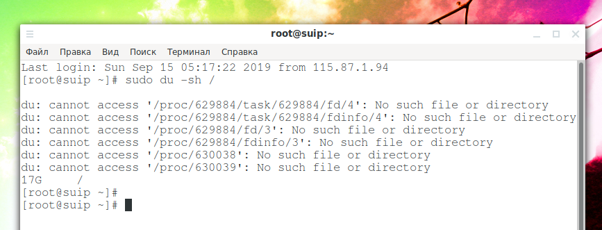 Начнём с du. Укажем ей базовую директорию на диске у которого проблемы. Это руководство подразумевает, что проблемным диском является раздел с рутом.