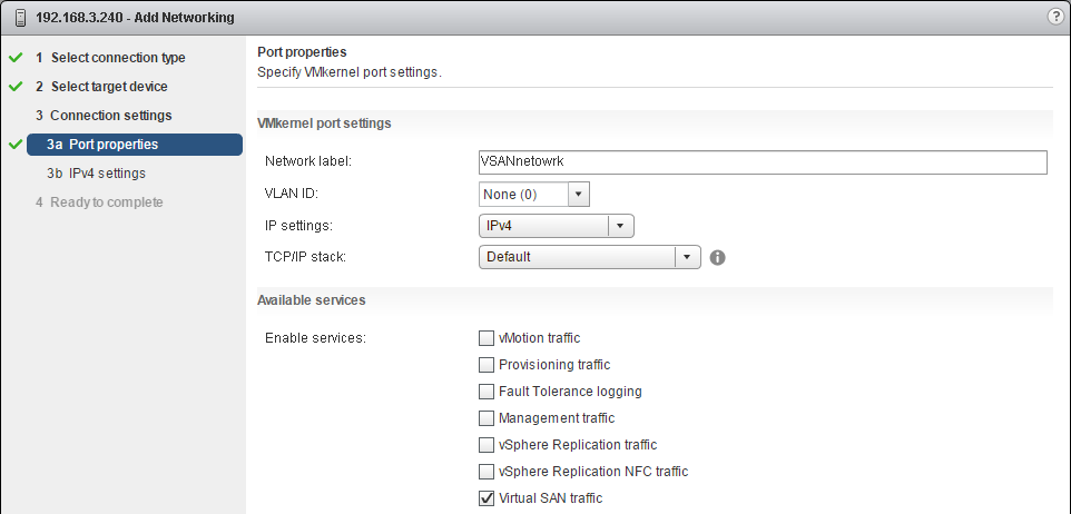 - На странице “ Port properties” ставим чек-бокс на опции “Virtual SAN traffic” (рис. 4) и переходим к настройке VMkernel-адаптера: указываем Network Label, VLAD ID для разделения vSAN-трафика и IP Settings.