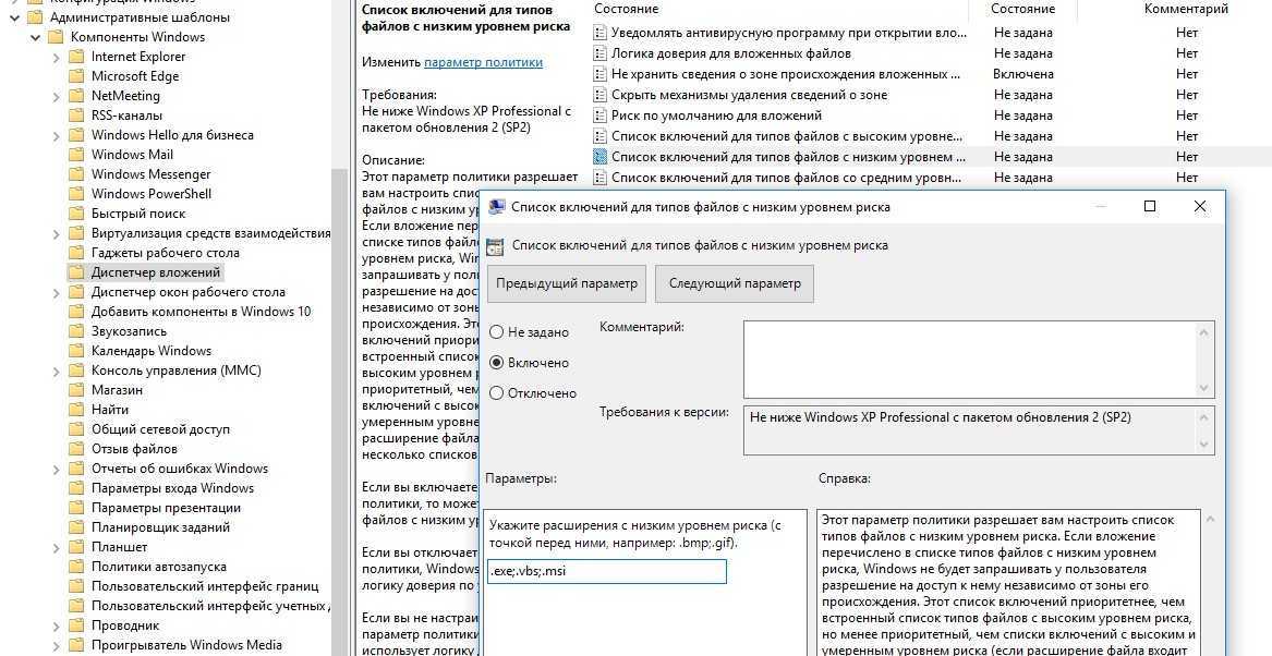 Задействуйте политики «Удаление сведений о зоне происхождения вложений», если хотите чтобы все файлы запускались без предупреждения. Или политику «Список исключений для типов файлов с низким риском», если хотите ограничиться файлами с конкретными расширениями. В последнем случае вам будет предложено указать расширения для файлов запускаемых автоматически.