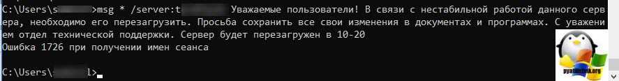 Если у вас выскакивает ошибка «Ошибка 1726 при получении имен сеанса» и сообщение не отправляется, то тут вся загвоздка в том, что у той учетной записи от имени которой открыта командная строка, просто не хватает прав. Вам нужно открыть cmd от имени пользователя у кого есть права на тот сервер.