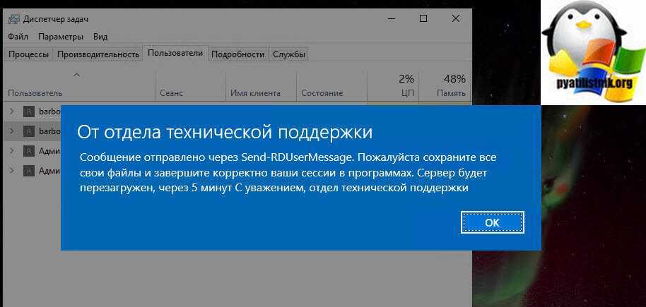 Во времена терминальных служб на Windows Server 2008 R2, была замечательная возможность массовой отправки сообщений для всех пользователей фермы и делалось, это штатно из диспетчера задач. В 2008R2, когда вы запустите диспетчер задач и перейдете на вкладку «Пользователи», то у вас была возможность выделить их всех, щелкнуть правой кнопкой мыши и из контекстного меню выбрать пункт «Отправить сообщение».