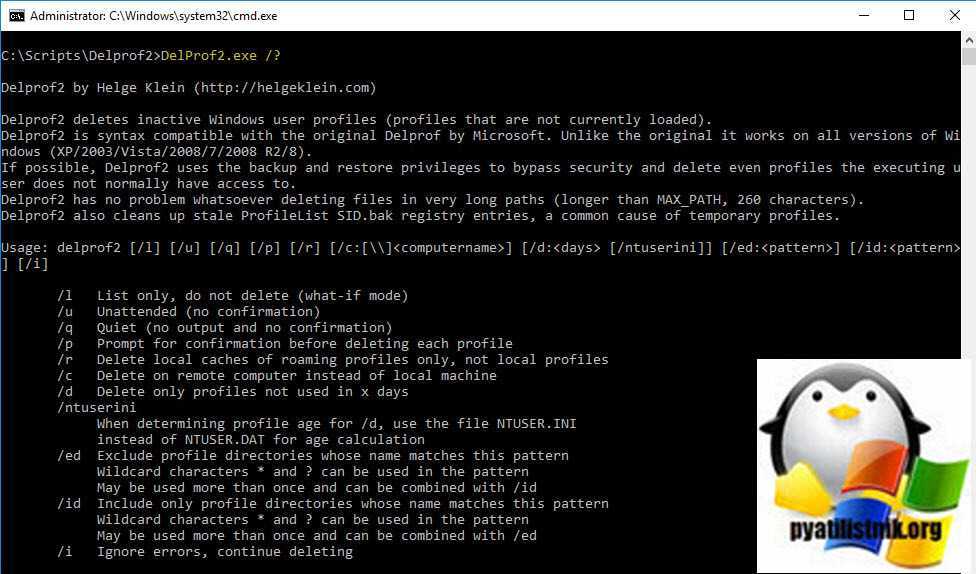 напоминаю, что если вы запустите DelProf2.exe, то без ввода параметров она удалит все профили, кроме вашего, так что пока не запускайте, а изучите доступные ключи