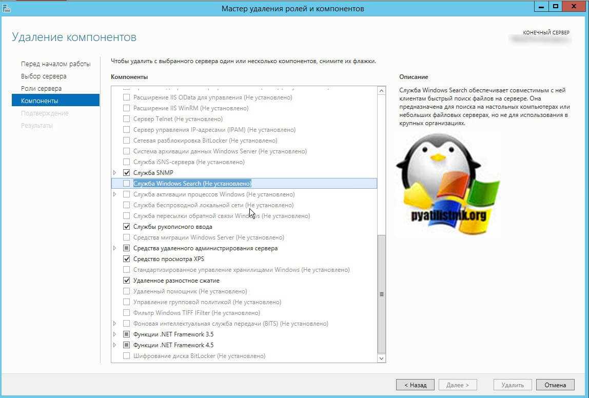 Еще одной из рекомендаций в данной ситуации, это отключение службы поиска Windows. Напоминаю, что в Windows Server 2012 R2 и выше, данная служба устанавливается, как компонент, если она вам не нужна, то удалите его.