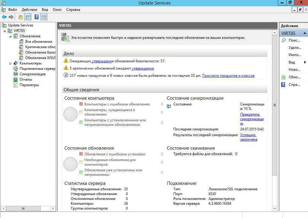 Перед вами откроется оснастка WSUS в ней сразу увидите сводку о состоянии инфраструктуры