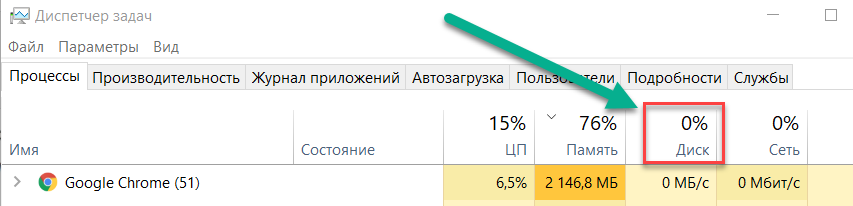 Во вкладке «Процессы» обратить внимание на столбец «Диск», где указывается общая загруженность.