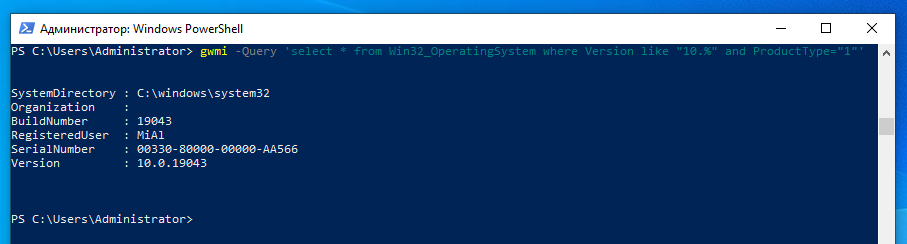 gwmi -Query 'select * from Win32_OperatingSystem where Version like "10.%" and ProductType="1"'