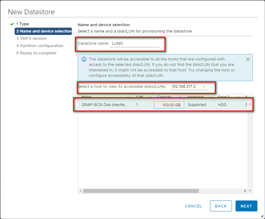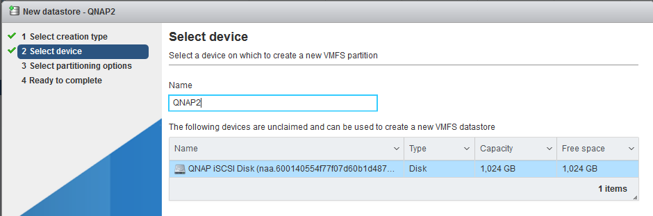 Step 10: Enter a name for the datastore, select a host, and select the iSCSI device to use for your datastore.