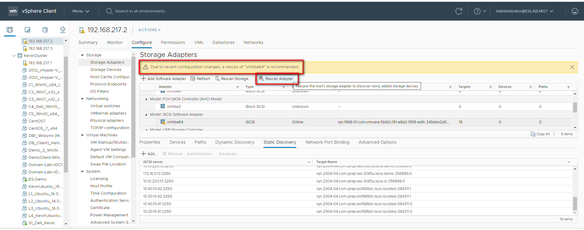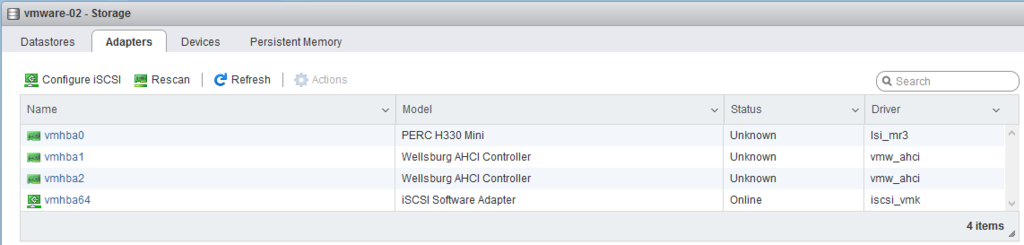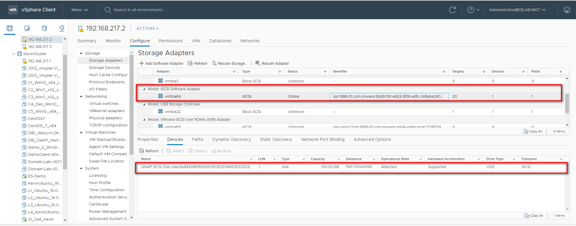 If your ESXi host is properly setup you may find it has already connected to your iSCSI target. This page shows a connection to the target, select «action» then «View Connections» to see if your host is in fact connected.