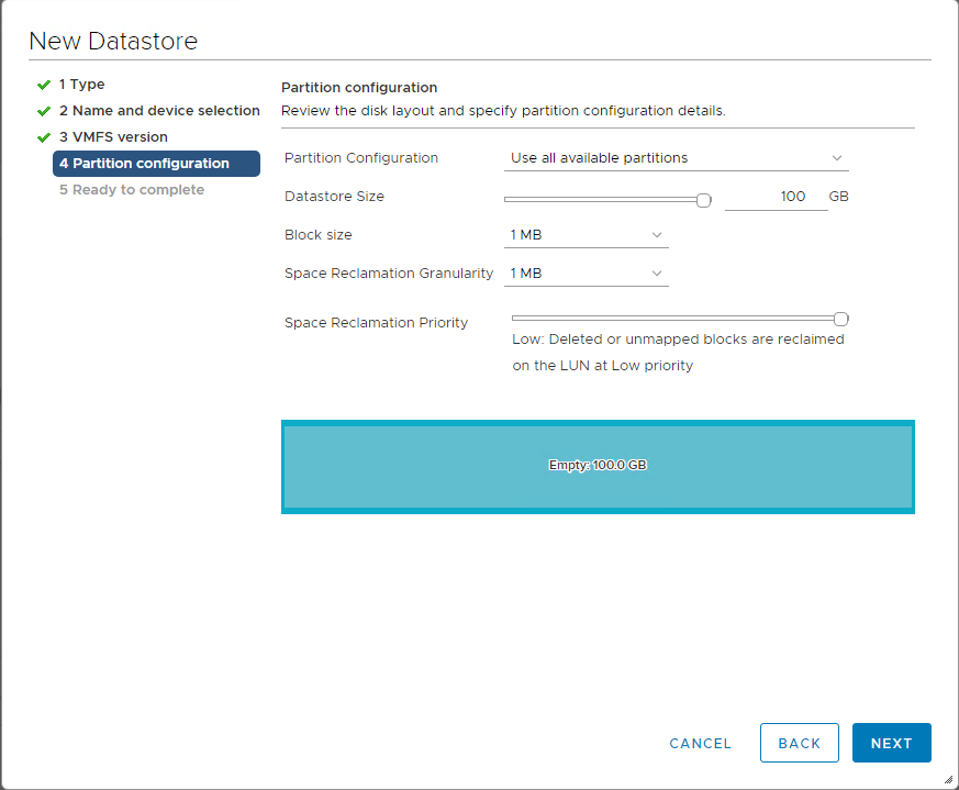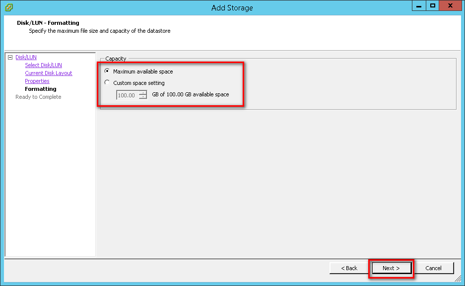 Here you decide how much space you are going to use for your new datastore. You can use 100% of the LUN you created, or a smaller amount.